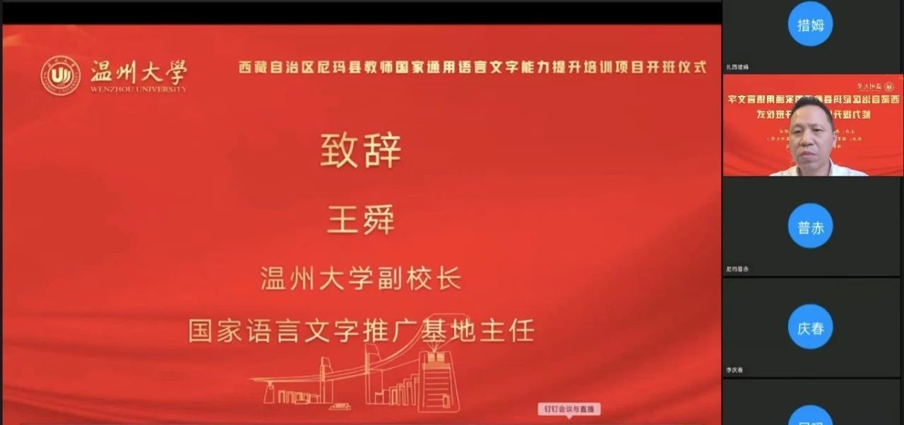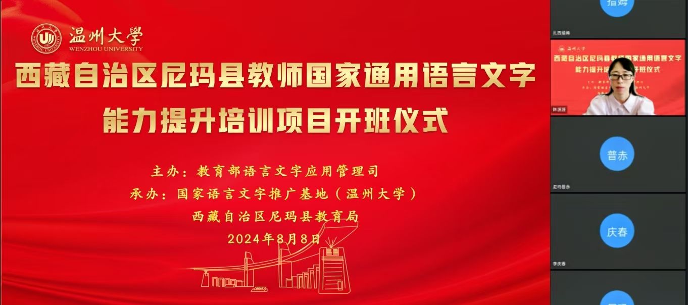 8月8日上午,由语言文字应用管理司主办,国家语言文字推广基地(bat365在线中国官网登录入口)、西藏自治区尼玛县教育局联合承办的“2024年西藏自治区尼玛县教师国家通用语言文字能力提升培训班”举行了线上开班仪式,国家语言文字推广基地(bat365在线中国官网登录入口)执行主任陈源源教授主持仪式。