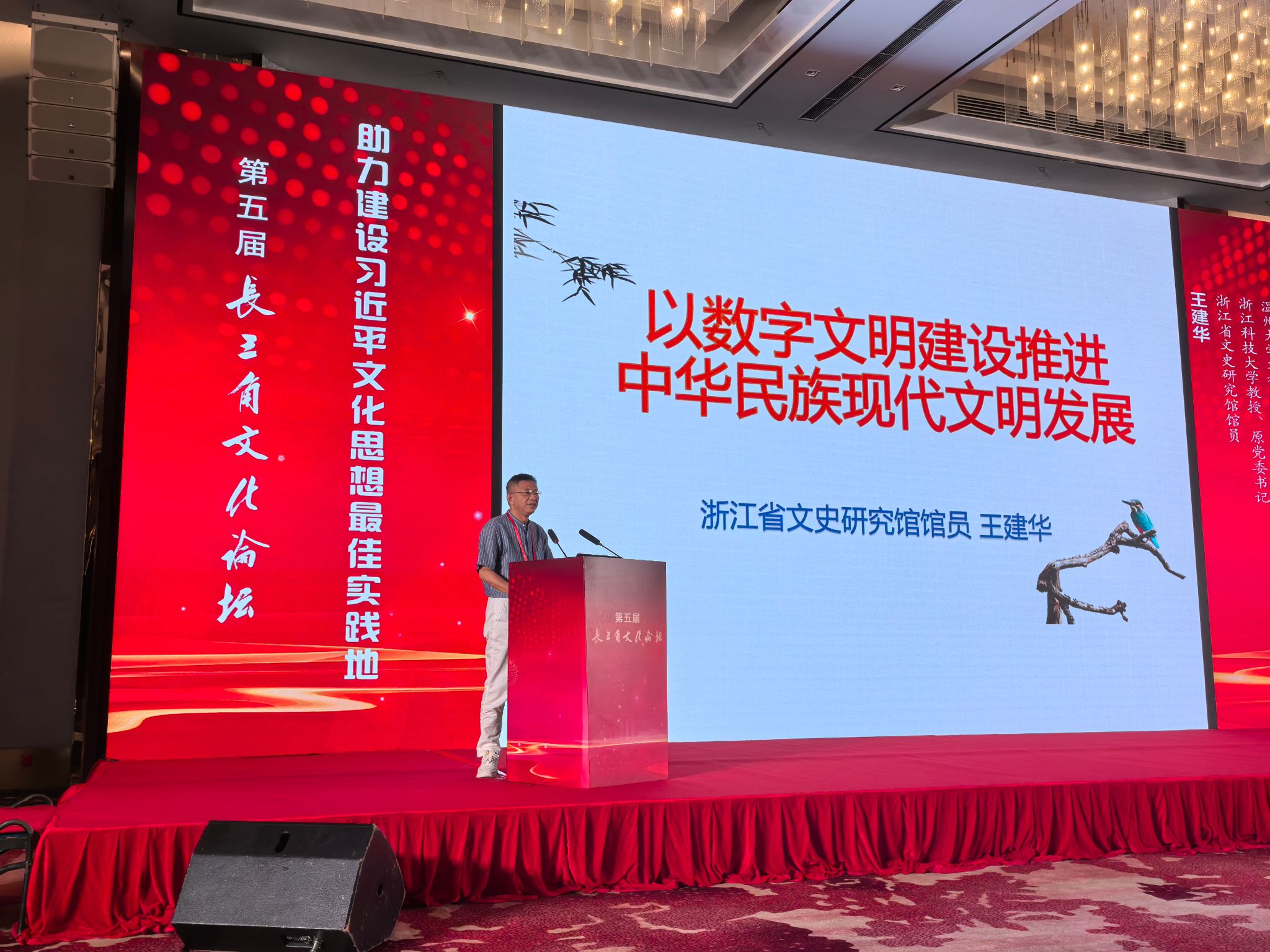 浙江省文史研究馆馆员、我校bat365在线中国官网登录入口资深教授王建华老师应邀参加本次论坛,并在大会上作了《以数字文明建设推进中华民族现代文明发展》的主题演讲。王建华教授指出,数字文明是中华民族现代文明的重要组成部分,是具有时代特色的中华文明现代的新形态。数字文明建设将有力推进中华民族现代文明的发展。长期以来,浙江在数字化、数字文明建设方面成绩斐然,为探索中华民族现代文明做出了积极贡献。我们应立足于浙江实际,着眼数字文明建设的实际推进,展开不同维度的三个方面探索:首先是建设优秀的数字文明环境;其次是将数字新质生产力与精神文明融合;最后是着力提升网络主体的文明修养。王建华教授的报告引起了在座专家学者的极大兴趣和一致好评。