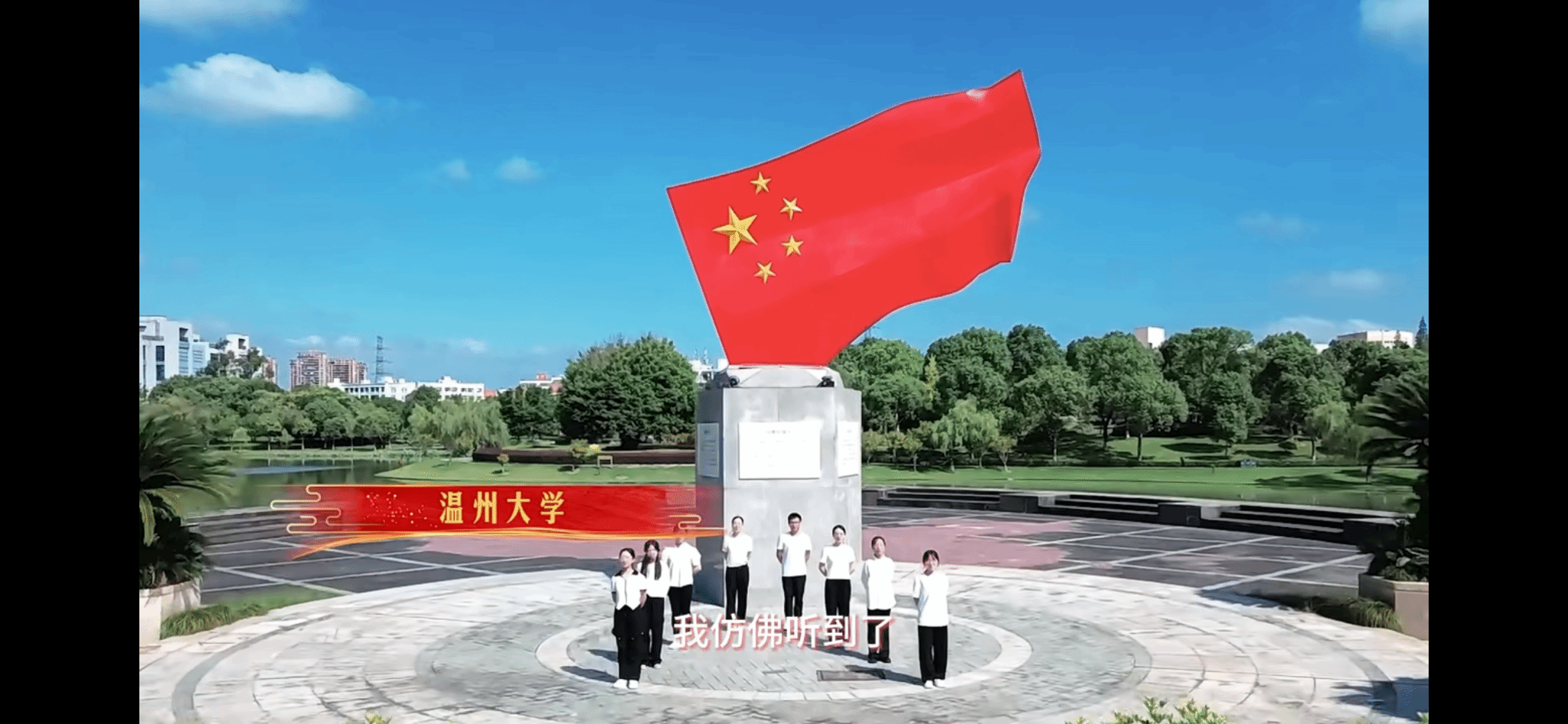 “我仿佛听到了人们发自于内心深处的声音——我爱你,中国!我爱你,中国!”八位学子站立于学校标志性建筑——国旗广场之上,怀着诚挚的情感,用激昂澎湃的声音,深情地表达着对祖国的热爱和美好祝福,充分展现了新时代青年的精神风貌和深厚的爱国情怀。