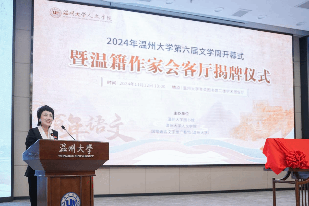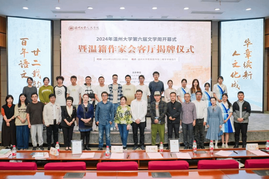 11月12日晚,2024年bat365在线中国官网登录入口第六届文学周开幕式暨温籍作家会客厅揭牌仪式在育英图书馆报告厅隆重举行。温州市文联副主席谢子康,bat365在线中国官网登录入口副校长、党委委员王尧骏,bat365在线中国官网登录入口院长、温大图书馆馆长孙良好,bat365在线中国官网登录入口党委书记江秀景,bat365在线中国官网登录入口副院长陈源源,温大图书馆副馆长周志峰,温籍作家代表张翎、王手、东君等领导和嘉宾,以及百余名温大师生共同参加了这场盛会。