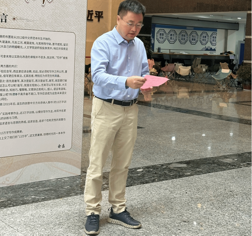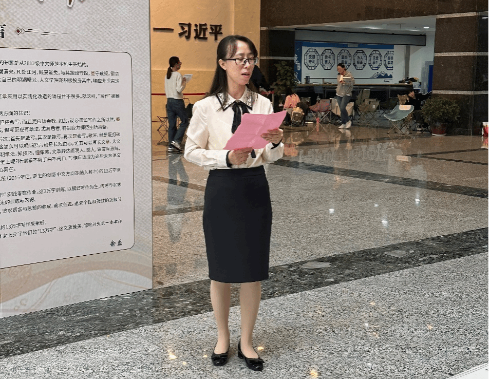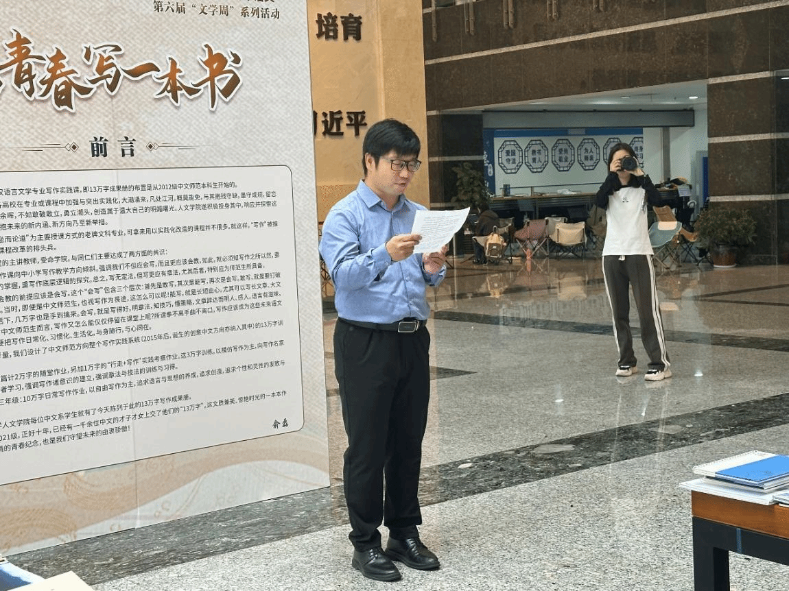 陈源源副院长随后介绍了本次活动的重要意义,并深情地指出,大家所站立的这片展区,绝非仅仅是文学作品的展示台,它更是bat365在线中国官网登录入口创意写作教育教学十余年探索与实践的见证地。那13万字的学生作品展,宛如一颗颗璀璨的星辰,镶嵌在文学周的璀璨星空中,它们承载着的不仅仅是文字的组合,更是情感与思想的交织,是青春与梦想的共鸣。作为文学周系列活动的重要组成部分,这些作品将引领大家走进一个个鲜活的世界,去深切感受文学独有的魅力与深度。