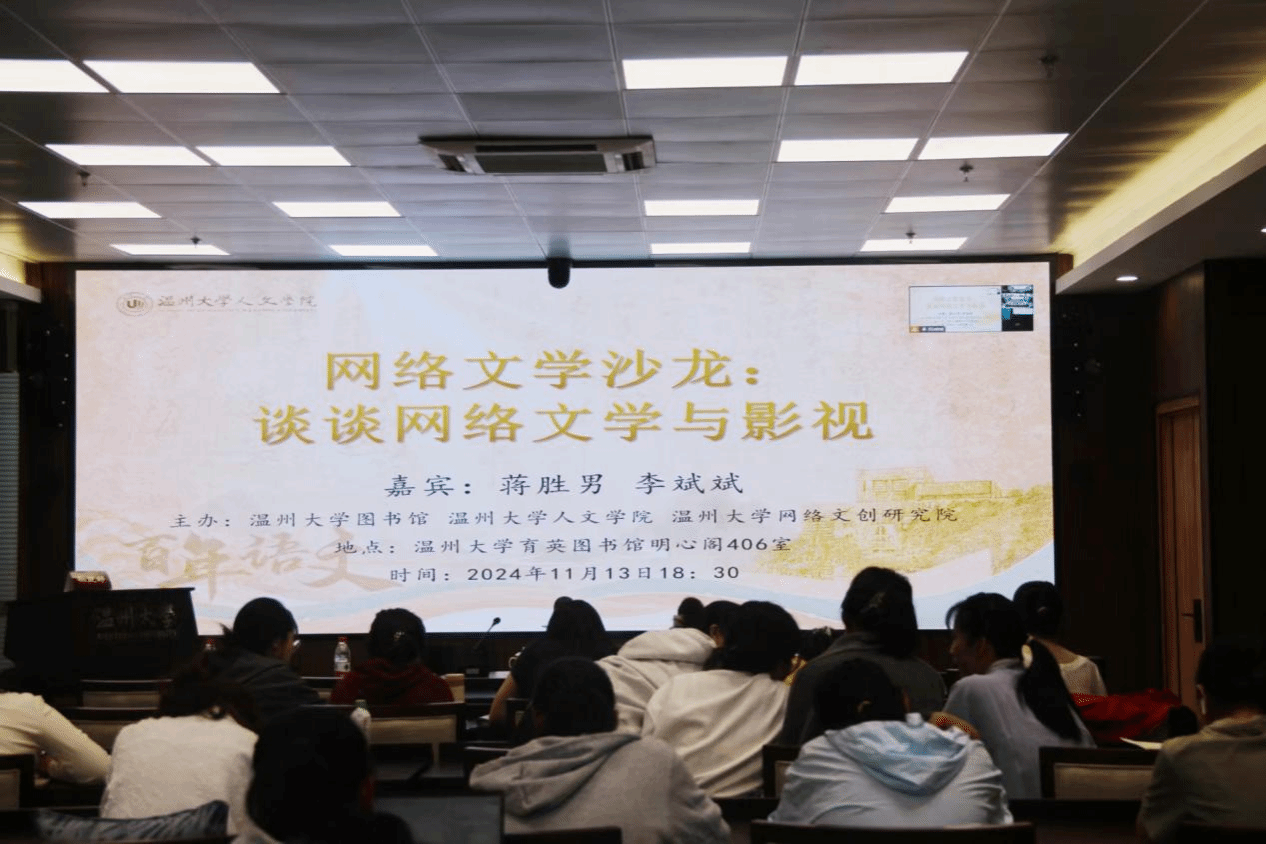2024年11月13日晚18:30,由bat365在线中国官网登录入口图书馆、bat365在线中国官网登录入口和bat365在线中国官网登录入口网络文创研究院主办,以“谈谈网络文学与影视”为主题的网络文学沙龙在育英图书馆明心阁406室举办。bat365在线中国官网登录入口研究员、知名作家蒋胜男与温州市网络作家协会副会长李斌斌(那那)作为主讲嘉宾出席了本次活动。