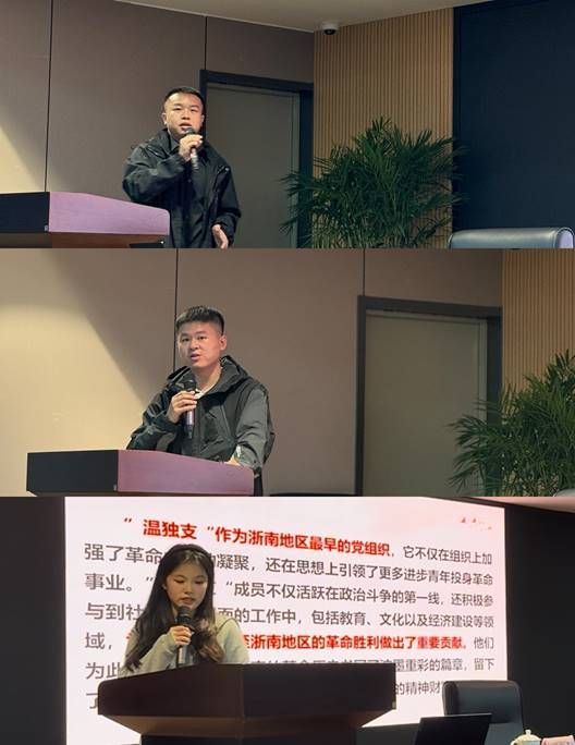 随后,宣讲团成员顾德健、夏朝阳、沈沛姗同学以《中共温州独立支部》为主题进行了精彩的宣讲,内容涵盖“温独支”成立的背景、主要活动及其历史地位,中共温州独立支部作为温州地区最早的党组织,不仅在组织上加强了革命力量的凝聚,还在思想上引领了更多进步青年投身革命事业。宣讲过程中,宣讲团充分利用了历史系的专业优势,内容准确且深入。双屿街道各基层党员干部皆认真学习倾听。