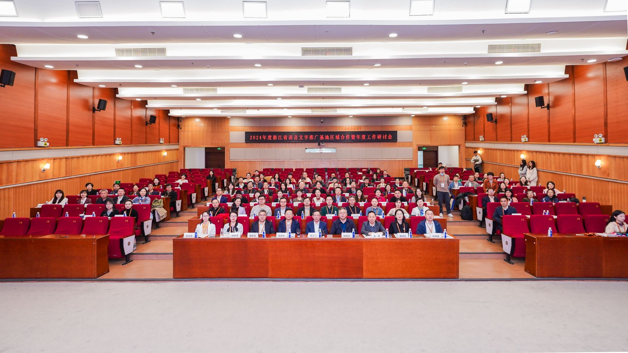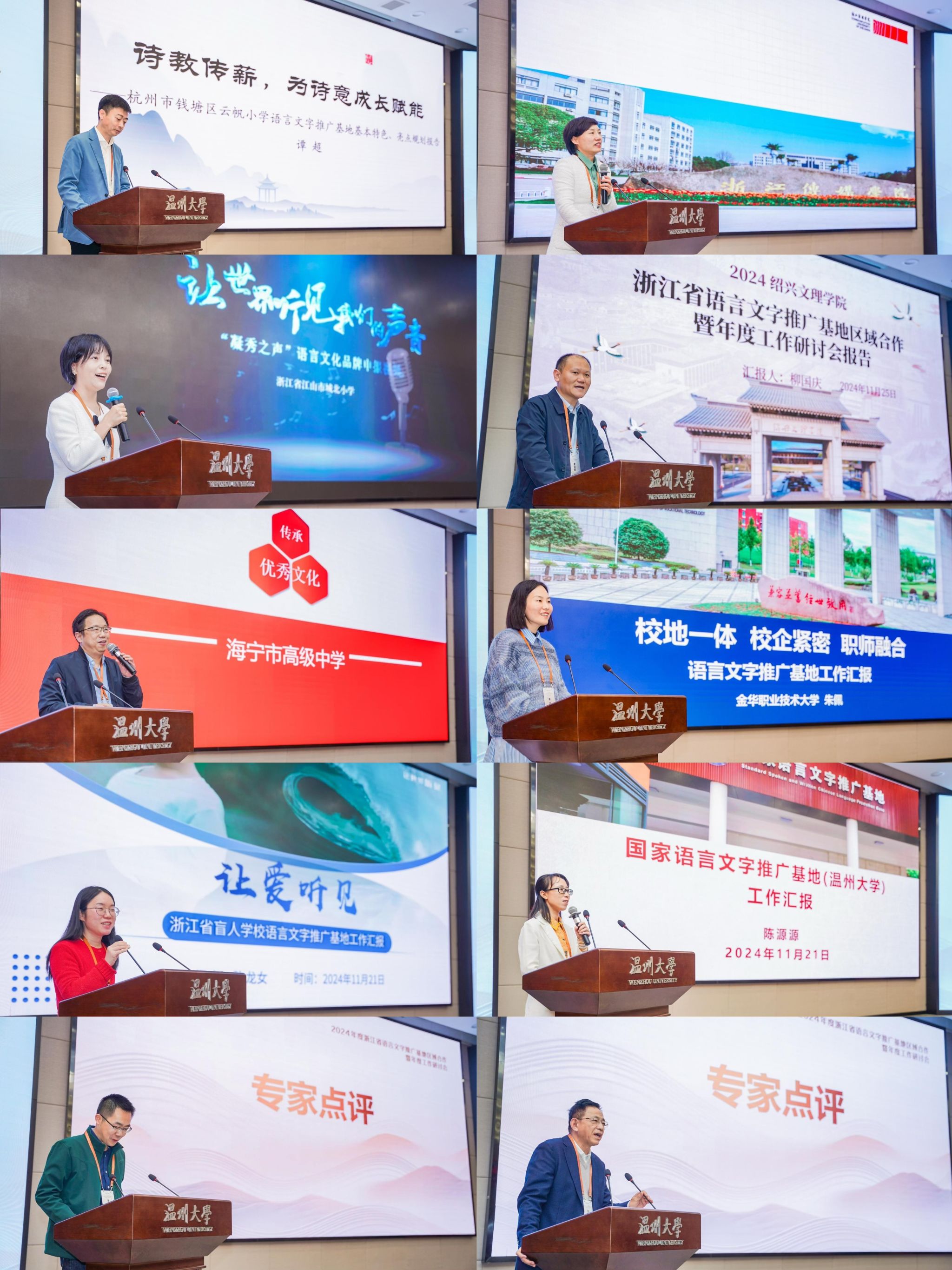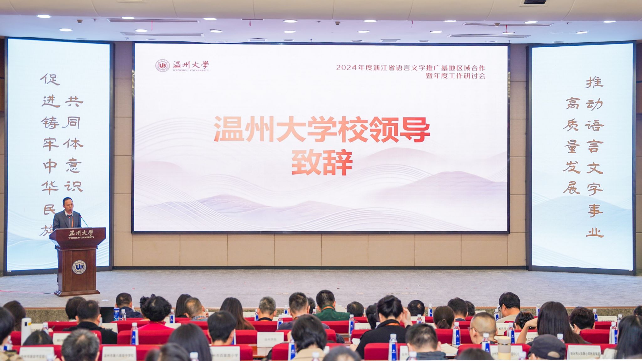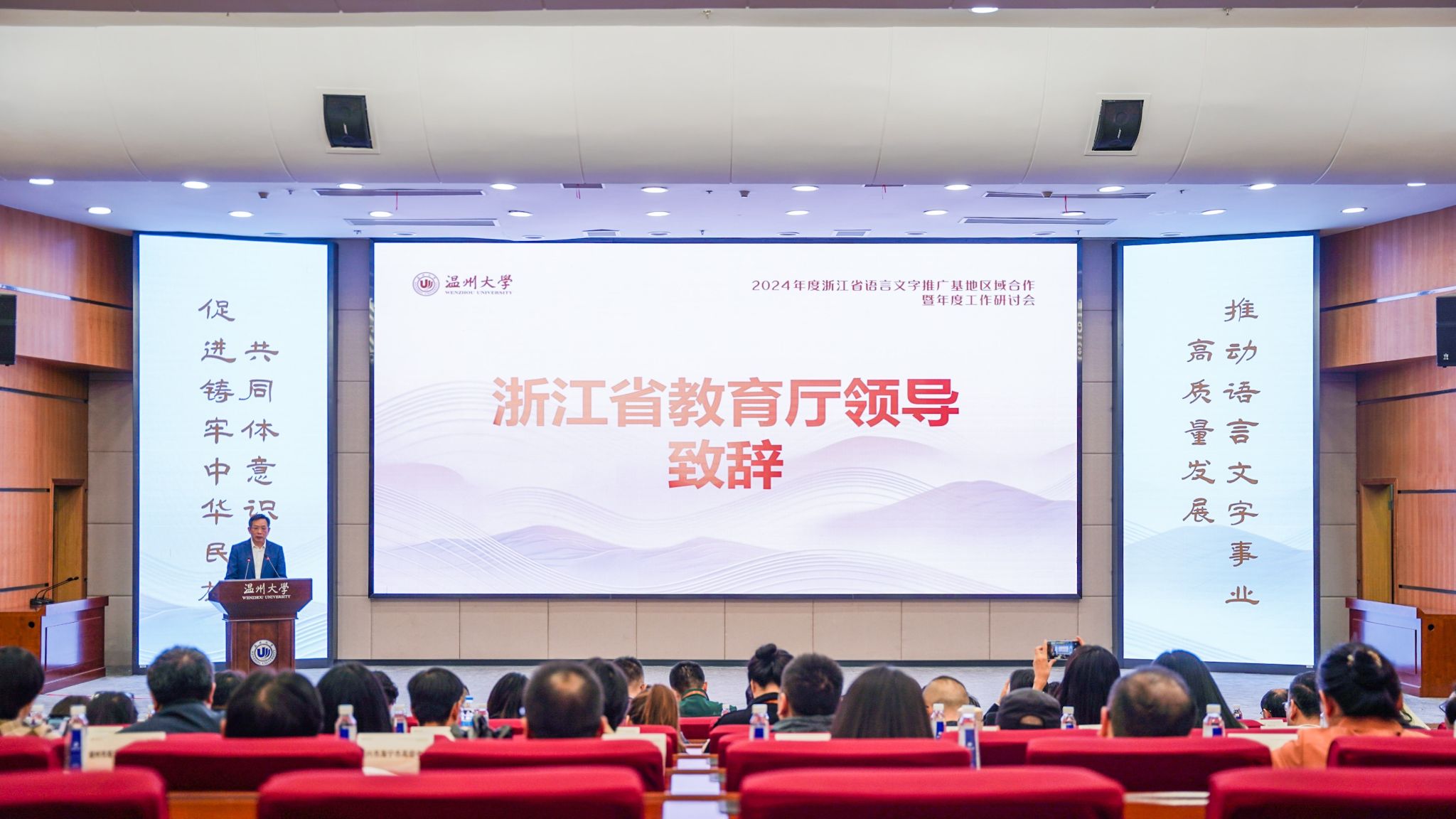 2024年11月21日,2024 年浙江省语言文字推广基地区域合作暨年度工作研讨会在bat365在线中国官网登录入口举行。本次会议由浙江省教育厅主办,国家语言文字推广基地(bat365在线中国官网登录入口)承办。浙江省教育厅二级巡视员、教材管理处(语管处)处长、省语委办主任朱鸿飞,61家省级基地负责人和各地教育局(语委办)100余人参加研讨会。