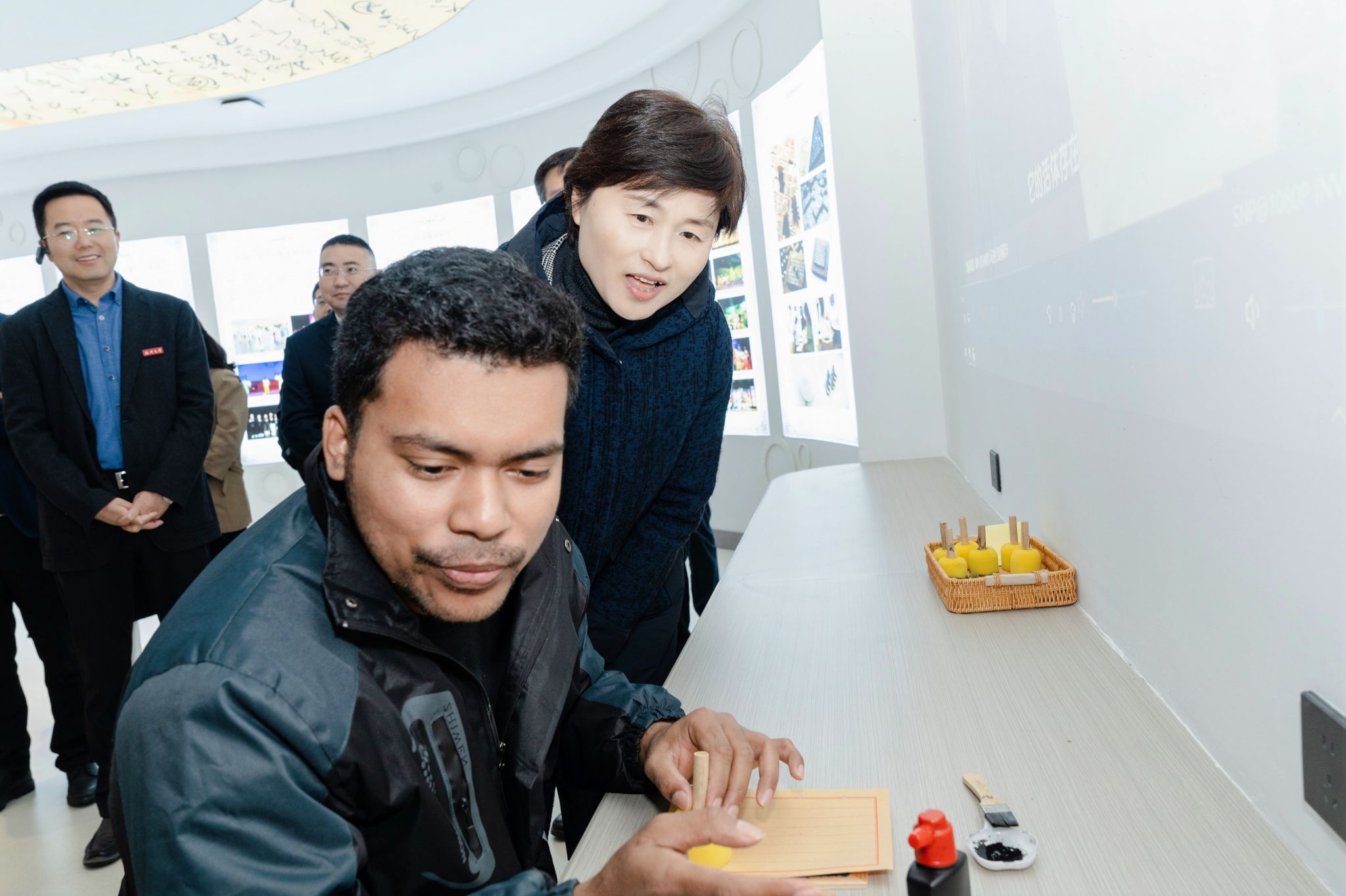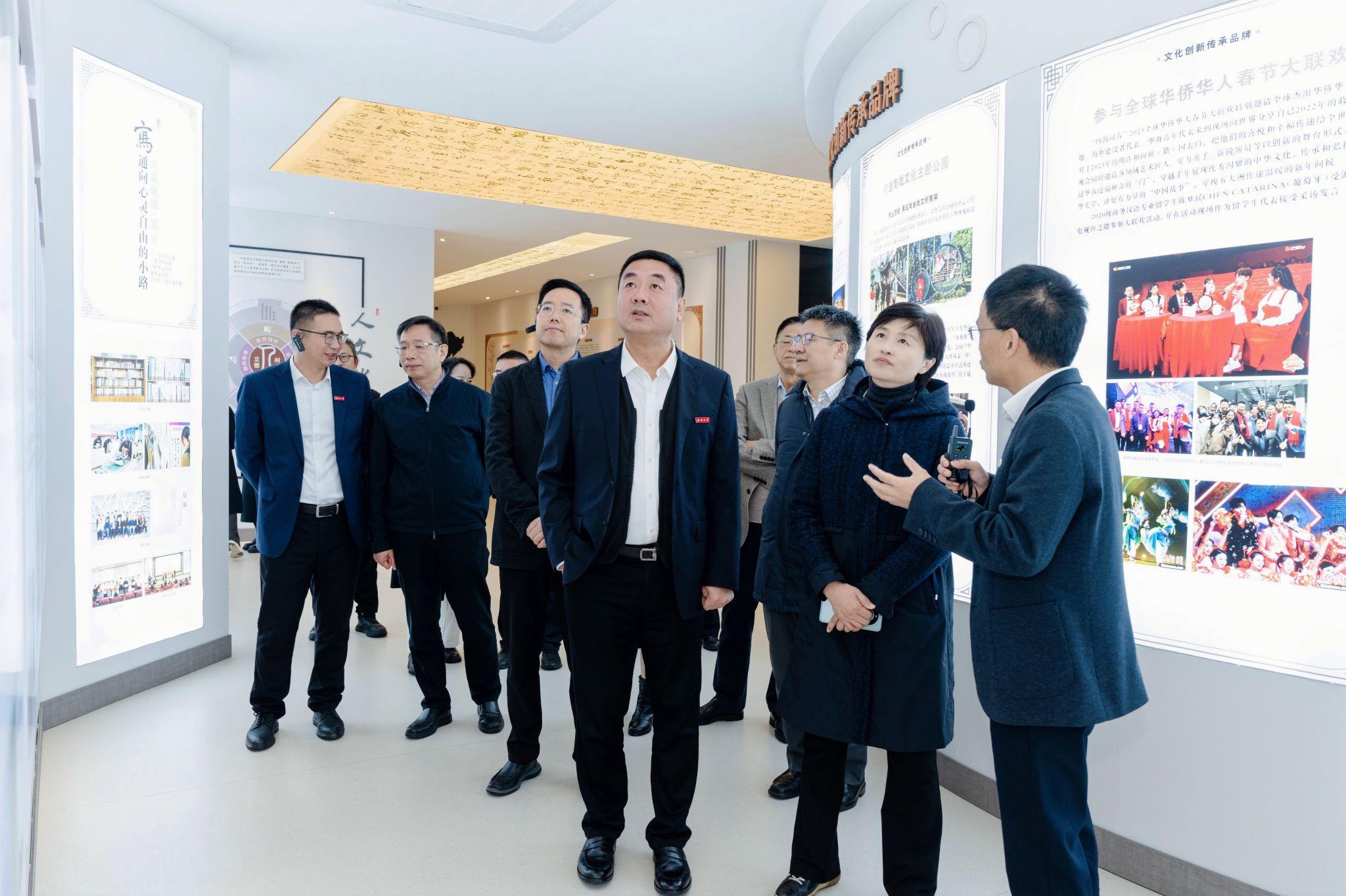 在调研的第一站,周为司长一行参观了国家语言文字推广基地展馆,详细了解了基地的发展历程、工作成果及未来规划。展馆内丰富的内容和详实的资料,生动展现了bat365在线中国官网登录入口在语言文字推广方面的坚实足迹和累累硕果。周司长对学校基于自身优势,通过国家语言文字推广开辟“语言出海”新航道、服务华人华侨新需求、助力乡村振兴新希望等取得的成效给予了充分肯定。