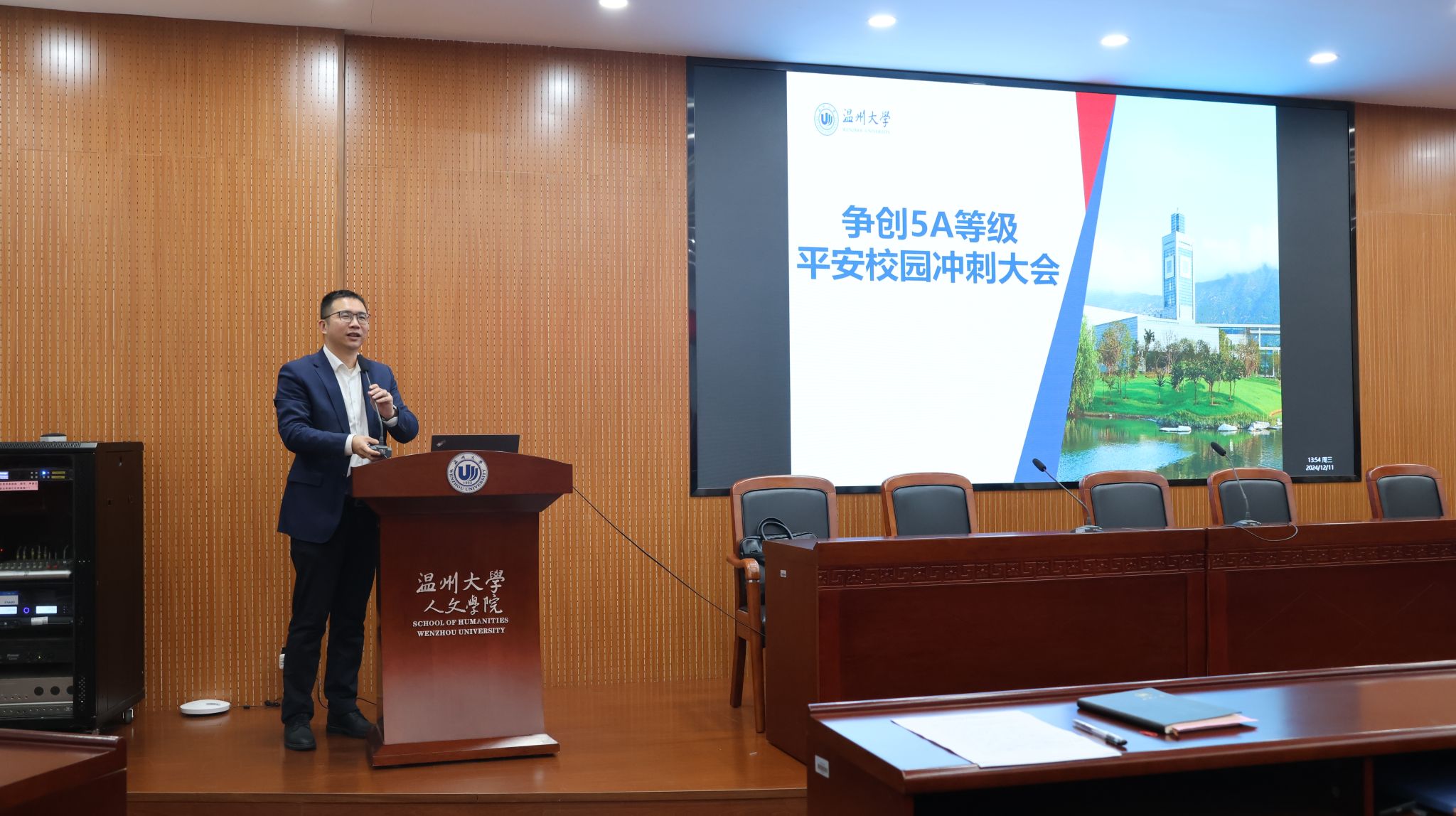 紧接着,江秀景书记就争创5A平安校园的相关注意事项进行了详细说明。他指出,平安校园建设是学院工作的重要组成部分,也是保障师生安全、维护校园稳定的重要举措。江书记从校园安全、消防安全、食品卫生安全等多个方面进行了详细讲解,并提出了具体的防范措施和应急处理方案。他要求全体教职工要时刻保持警惕,加强安全意识教育,共同营造一个和谐、安全、稳定的校园环境。