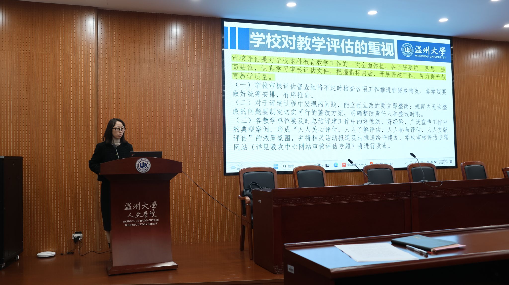 陈源源副院长就本科教育教学评估会的相关事宜进行了详细说明。她强调,本科教育教学评估是对学院教学质量、管理水平以及整体办学实力的一次全面检验,对于提升学院的社会声誉和竞争力具有重要意义。陈副院长从评估的背景、目的、内容以及具体安排等方面进行了全面阐述,并要求全体教职工以高度的责任感和使命感,积极参与到评估工作中来,共同为学院的荣誉和未来发展贡献力量。