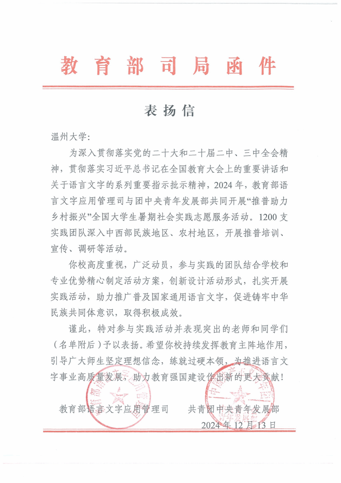 近日,我校在2024年“推普助力乡村振兴”全国大学生暑期社会实践志愿服务活动中的突出表现得到了教育部语言文字应用管理司与共青团中央青年发展部的联合表彰。