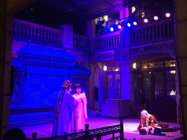 演出于七点半准时开始,深情旁白娓娓道来,一下子就将观众带入渴望爱情的情境氛围。杜丽娘与柳梦梅带着愁怨出场了,水袖轻扬。曲调深婉缠绵,清丽悠远,演员在舞台上感情饱满,表现了鲜明的人物个性。更妙的是罗密欧与朱丽叶的惊艳登台,剧场的二楼栏杆被精心布置成花园阳台,精美的扮相,清脆的对白,感情充沛,收放自如,让人移不开眼。