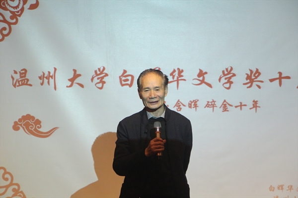 在轻缓的乐声中,一段回顾白晖华文学奖缘起的视频开启了本次沙龙。在视频中,吴明华先生与朱闻武先生两位发起人谈到了文学奖的由来,是对文学的热情和与温大的渊源,促生了白晖华文学奖并一路坚持。接着,由潘玉驹部长为本次沙龙致辞,他深切表达了对吴先生十年来支持和鼓舞的感谢,并讲到希望白晖华文学奖如一粒种子、一盏灯,指引我校学子文学情怀的成长。接下来,朱先生邀请孙良好教授和图书策划人方韶毅先生上台坐叙。两位分别从温大创办文学奖的积极意义和社会力量促进教学的角度阐述了白晖华文学奖的重要性,白晖华文学奖对于我校学子文学道路具有很高的启蒙意义,这是来自民间难能可贵的文化慈善。中场,由温州市知名音乐人郑明武先生带来的一段古典吉他演奏。之后,蔡贻象院长讲话,他谈到,高校教育是促进文学理论传播,而白晖华文学奖是文学理论实际化的重要表现形式,十年中吸引了十几个学院的学子参赛,这是一种很好的创意思维的训练方式。吴先生的文学慈善行为,满足了广大青年的文学需求。他代表学院对吴先生在此中作出的重要推动表示感谢。随后播放了历届获奖学生代表的采访视频及几位老师的寄语。视频过后,朱先生敬邀吴明华先生上台讲话。吴先生讲话精简而深情,他忆起温大的第一个文学社便是由他担任辅导老师,可谓渊源深厚,或者说是对温大的一种情节。他表示,在有生之年会一直继续坚定支持白晖华文学奖的举办。来自温州文化馆的曾春玲女士以一段深情朗诵《我跟冬天有个约会》打动了全场。接下去,各界学生代表上台发表感言并在沙龙特制纪念品——白晖华文学奖台历上签字,并敬赠吴明华先生。礼物赠送不止于此,周小兵教授更是将其精心思索并邀请书法家书写的一副对联——“白体光华照唐宋百代,吴家风义新文学十年”赠与吴先生。最后,全体嘉宾及工作人员合影留念。