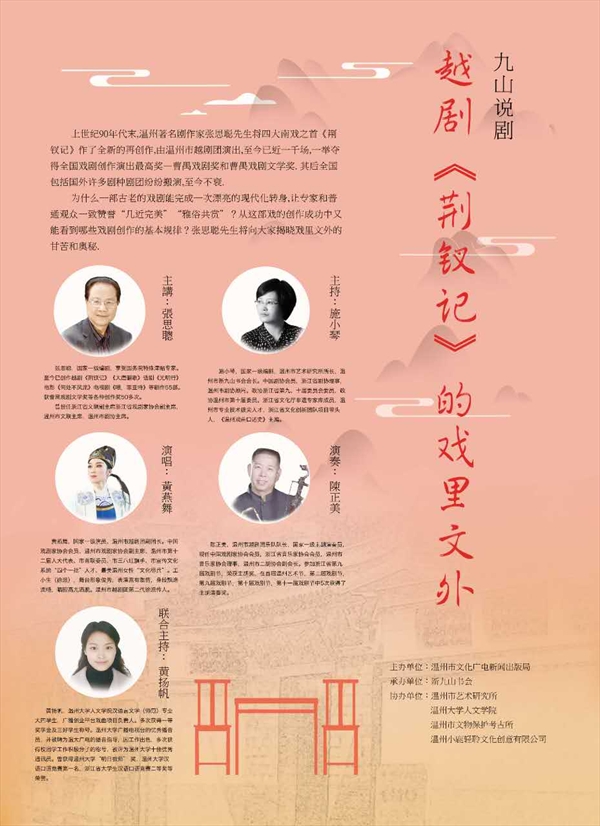 11月20日上午,新九山书会公益培训课程第二讲“越剧《荆钗记》的戏里文外”主题沙龙在南戏博物馆内和广大戏剧爱好者如期见面。本次活动由国家一级编剧、浙江省文联副主席、温州市文联主席张思聪老师主讲,温州市艺术研究所所长、新九山书会会长施小琴和bat365在线中国官网登录入口广雅团队成员黄扬帆同学联合主持,温州市文化广电新闻出版局副局长柳升高,bat365在线中国官网登录入口副书记朱启鑫,国家一级演员、温州越剧团副团长、著名演员黄燕舞女士,温州越剧团一级演奏主胡陈正美及本院金凡平、洪之渊老师等特邀嘉宾出席。到场观众有bat365在线中国官网登录入口广雅团队学生成员以及社会各界戏曲爱好者四十多位。