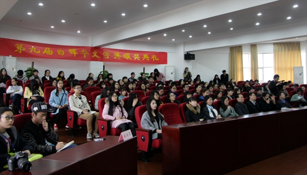 颁奖典礼简洁又隆重。首先通过一段视频,我们回顾了白晖华文学奖从无到有,一路走来的历程,还有获奖者对这个奖项意义的解读。接着由学生代表向吴明华先生献上鲜花表达敬意之情,吴先生也跟大家讲述了自己的创作故事以及创作心得,并鼓励文学爱好者们永远保持自己的创作激情,为自己的文学梦想而努力。随后获得一二三等奖以及鼓励奖的同学上台领奖,嘉宾为他们颁发了奖项。学生代表骆雪娟和徐清海朗诵了获奖诗歌《一个女人一个深渊》和《岳阳楼记》,与在场所有文学爱好者共同欣赏这两篇优秀的诗歌。然后获奖代表王一莉同学上台发言,分享了自己四年来对白晖华文学奖的感情以及白晖华文学奖对她伯乐一般的重要作用,多次获奖的经历也给了她极大地鼓舞和支持,促使她笔耕不辍,不断向前。最后校党委宣传部部长潘玉驹上台总结发言,首先代表bat365在线中国官网登录入口对吴先生数年来无私的支持与奉献表示感谢,同时向获奖同学表达了祝贺并对同学们寄予厚望,也希望青年作家们能够依托温大厚重、悠久的校史创造出优秀的文学作品。最后潘部长还提醒同学们,写作要以丰富的人生体验为基础,拓宽作品的深度和广度,只有这样才能让文学之花充分绽放。
