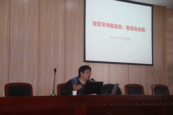 许教授紧紧围绕“创意写作的历史、现状和未来”这一主题,从创意写作的本体论、发生发展论和创意写作与当代生活两个方面展开论述。他指出,创意写作是一个历史的概念和发展的概念,当初指的是文学写作和文学写作教育,后来泛指包括文学写作在内的一切面向现代文化创意产业、适应文学民主化、文化多样化、传媒技术的更新换代等多种形式的写作以及相关的写作教育。接着,许教授从创意写作的指向和核心理念深入剖析创意写作的本质,并进一步阐发作为一门学科的创意写作的基础理论和学科方法。创意写作与传统写作不同,它主张写作可以教、可以学,作家可以培养、需要培养,注重潜能的激发和自我发掘。在分析完创意写作的内涵和学科体系后,许教授从创意写作与当代生活这个角度展望创意写作的未来。许教授高屋建瓴地对中国当代的一些问题和世界文化产业发展前景进行判断,结合抗日神剧、《2012》、《功夫熊猫》等影视剧作品深入浅出阐释中国对创意人才的迫切需求。创意写作依托写作能力,与文化创意产业紧密相连,是高校中文写作教育转型的关键。它的出现顺应了时代发展之势,为实现文化的发展和繁荣、建设文化强国提供人才培养机制。创意写作在未来大有可为。