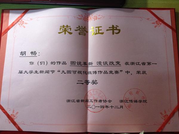 日前,浙江省首届大学生新闻节在浙江传媒学院举办,bat365官网12中本1班胡畅同学的作品《图说革新 漫谈改变》入围此次新闻节九图可视化微博大赛全省十强。