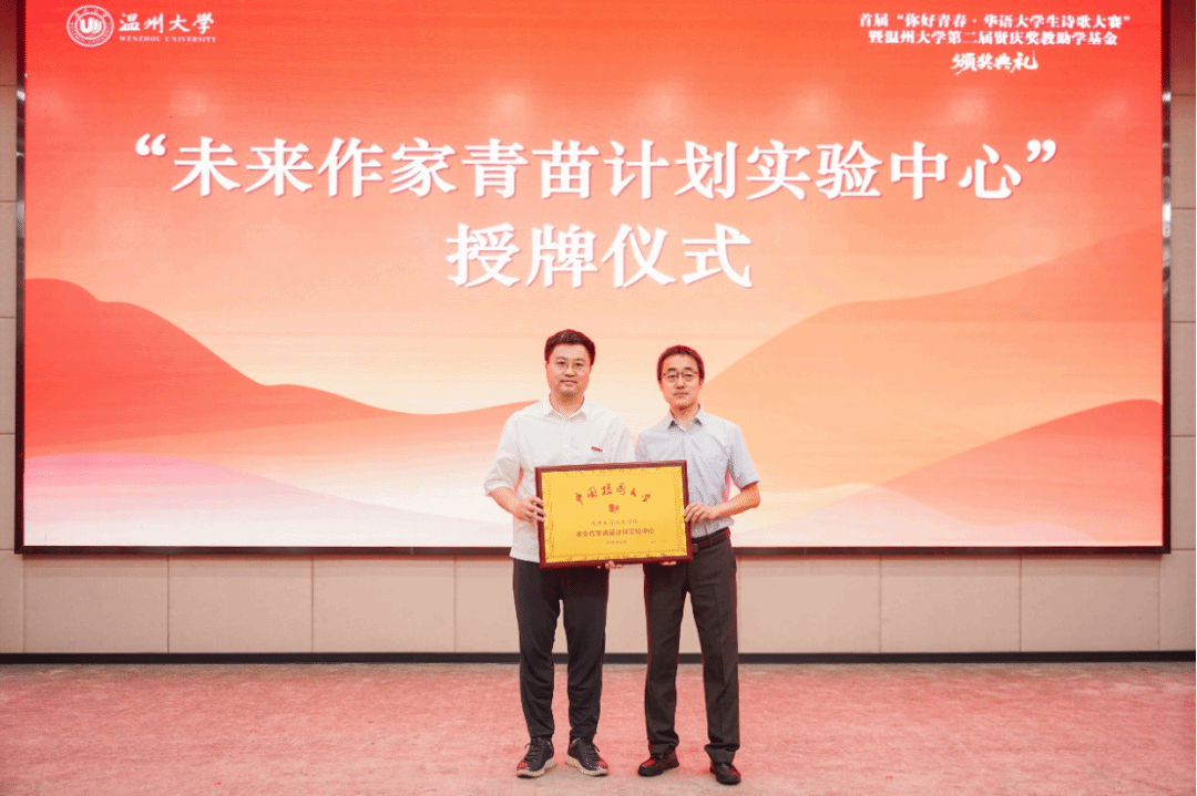 徐峙先生与bat365在线中国官网登录入口孙良好院长共同揭牌“未来作家青苗计划实验中心”,为热爱文学创作的学生提供更广阔的发展平台,助力校园文学人才培养。受邀嘉宾纷纷上台,为第二届“你好青春·华语大学生诗歌大赛”的正式启动按下手印。