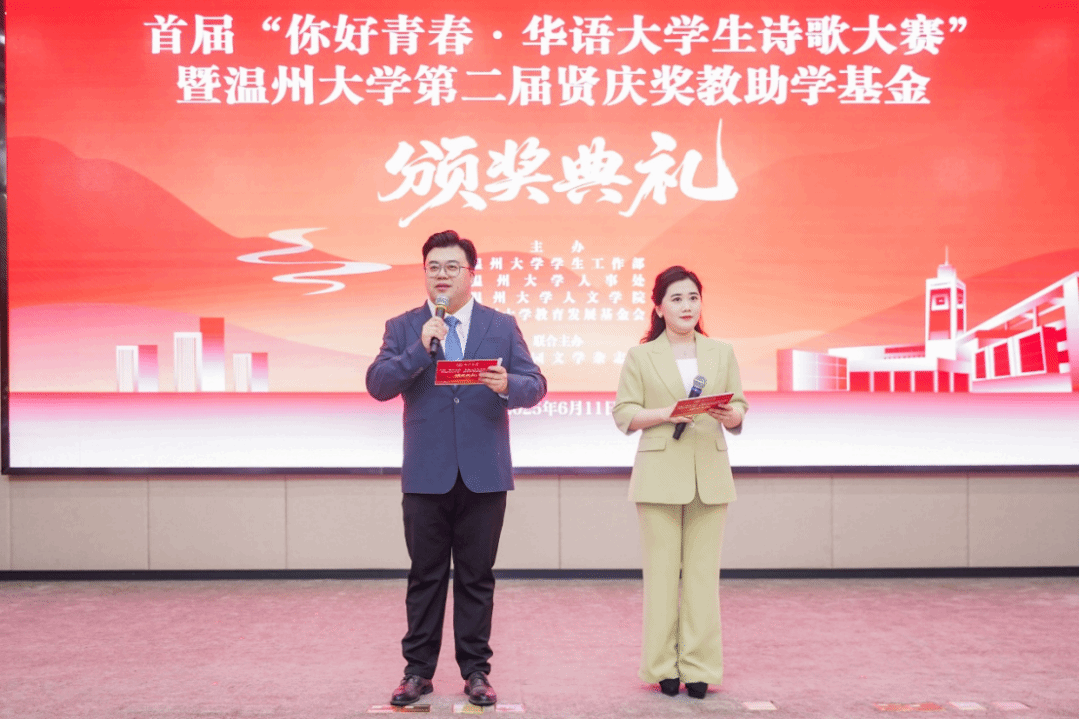 6月11日下午,首届“你好青春·华语大学生诗歌大赛”暨bat365在线中国官网登录入口第二届贤庆奖教助学基金颁奖典礼在育英图书馆二楼报告厅隆重举行。校党委副书记庄兴忠,中国作家协会诗歌委员会副主任梁平等专家学者,同师生代表共同参加典礼。