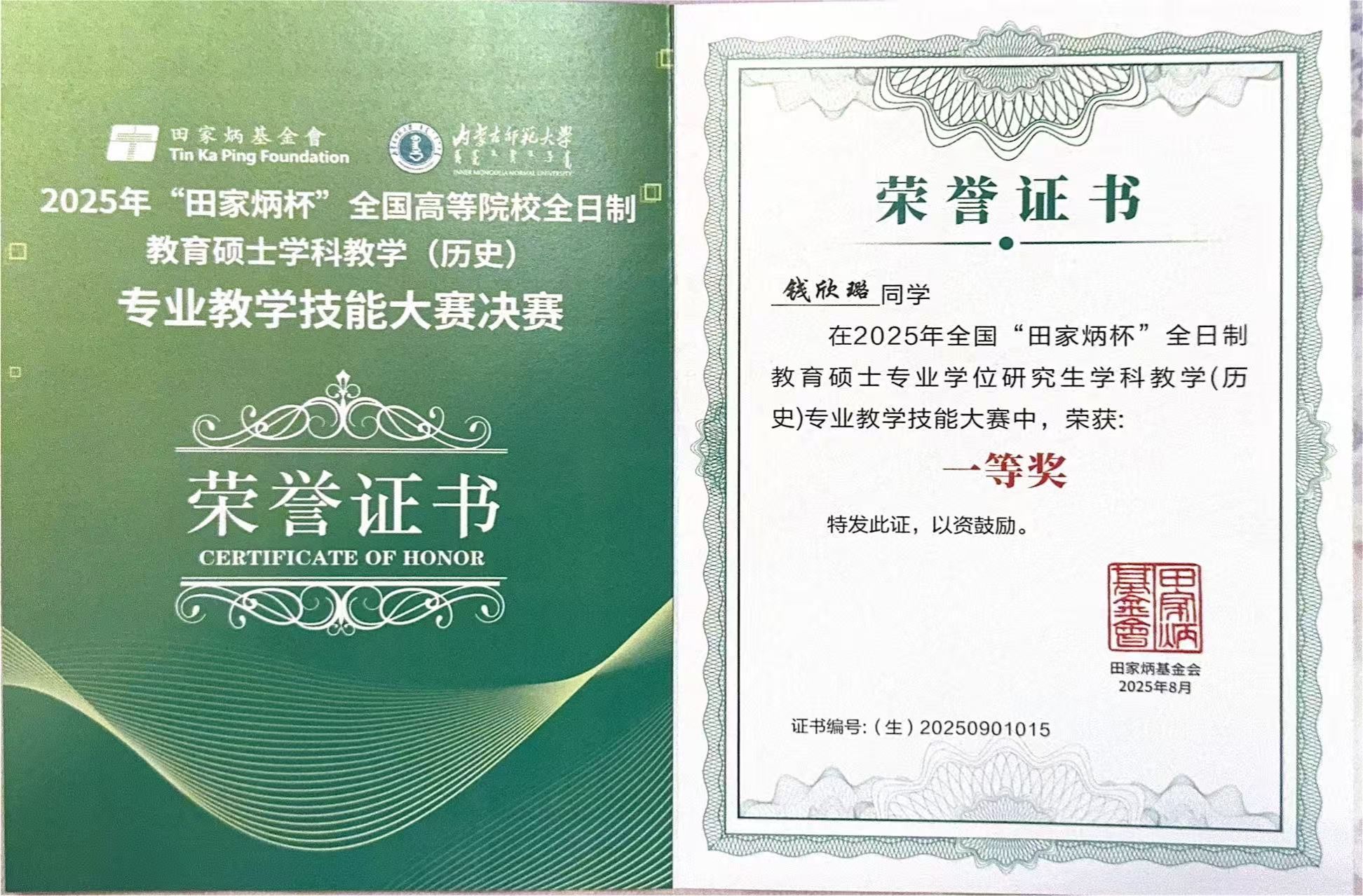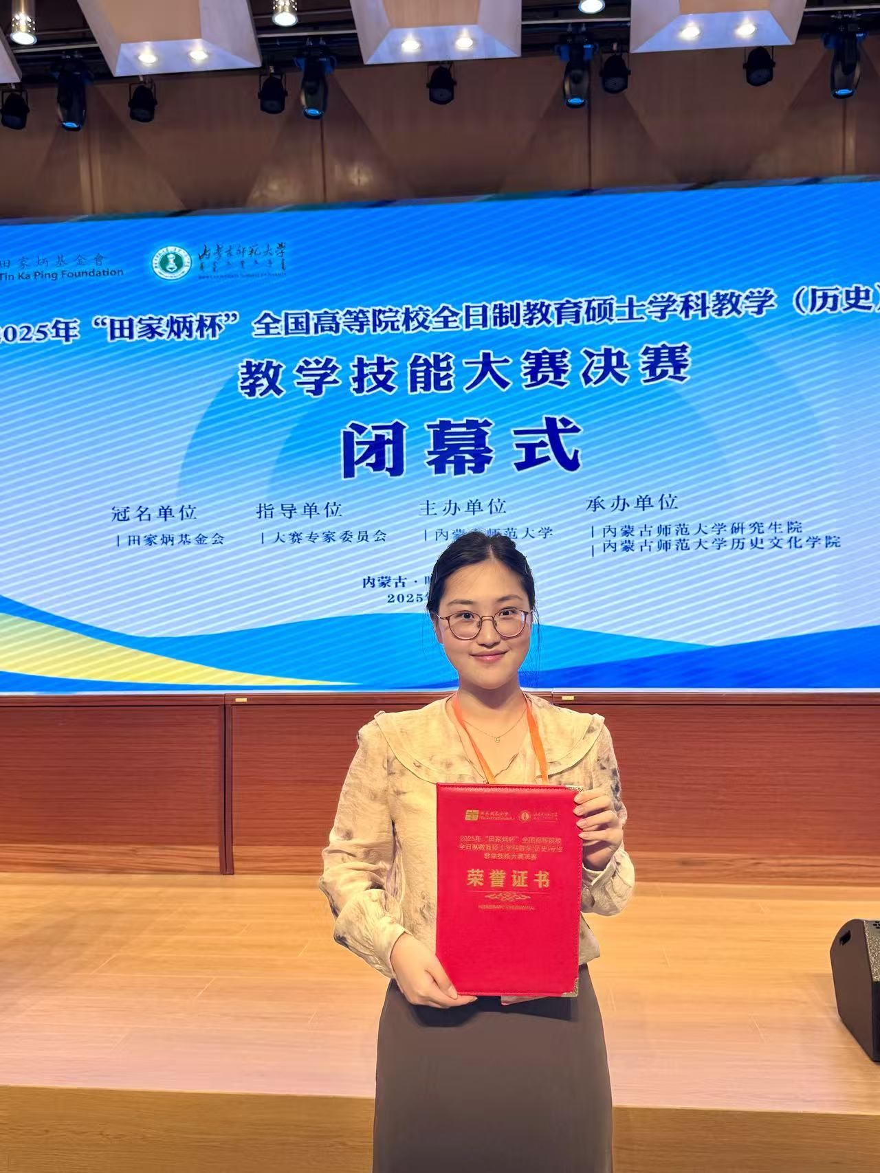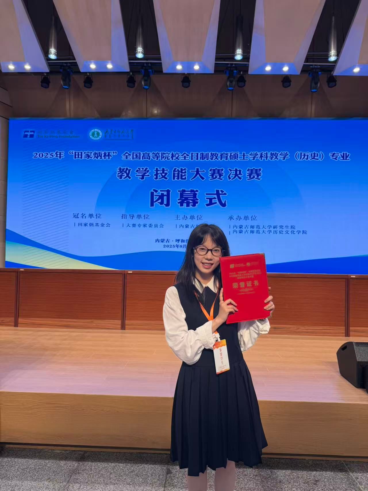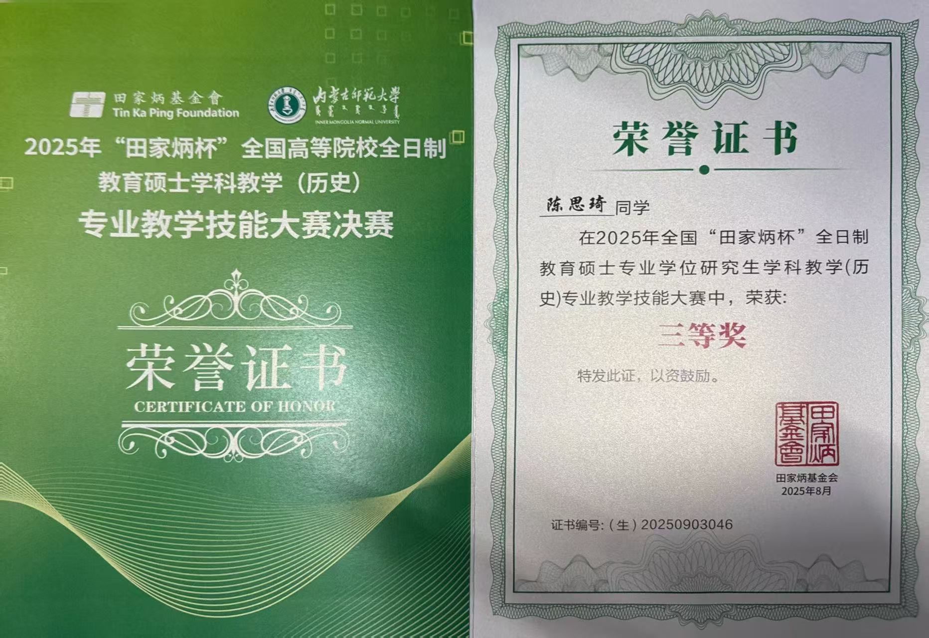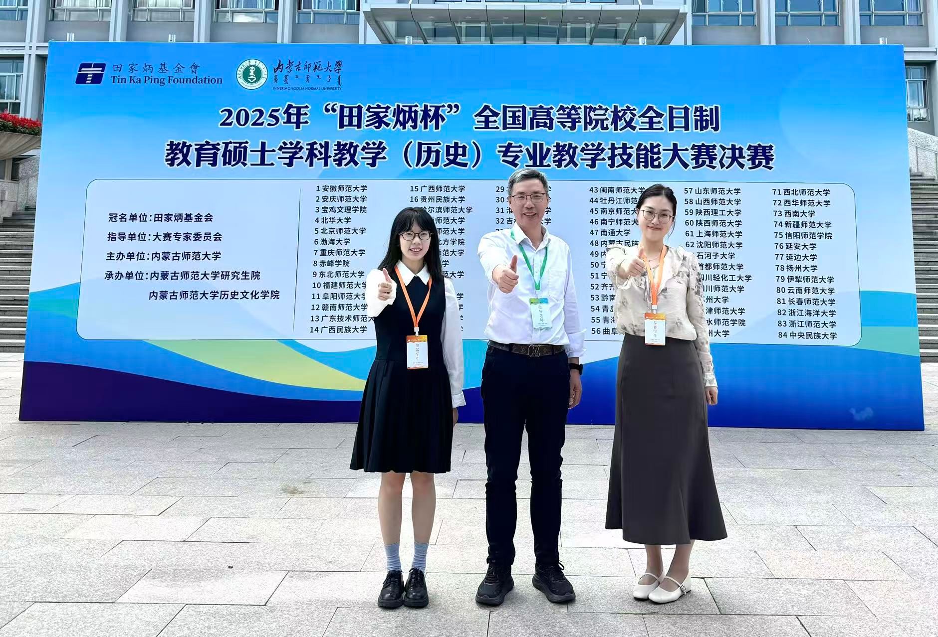 2025年8月22日至26日,2025年全国 “田家炳杯”全日制教育硕士专业学位研究生学科教学(历史)教学技能大赛决赛在内蒙古师范大学举行。该项赛事由全国教育硕士专业学位指导委员会指导,田家炳基金会冠名,内蒙古师范大学主办,吸引了来自北京师范大学、华东师范大学、华中师范大学等全国84所高校的160余名选手参赛。bat365官网历史系学科教学(历史)研究生由蒋金崇教授带队参赛,并在决赛中取得优异成绩,23级研究生钱欣璐、24级研究生陈思琦分别荣获一等奖和三等奖,祁刚博士获“优秀指导教师”奖。