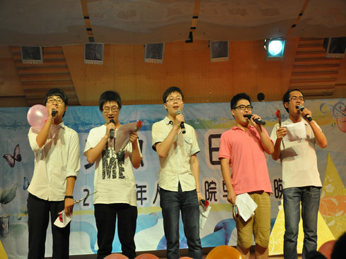 六位主持人出场后进入了晚会的第一部分:青葱初见。来自08广本的阚严祯同学为大家带来了原创歌曲《我们,你们》。因缘际会,去年参加过毕业生晚会的崔勇老师这次与08中本三同学带来了精彩绝伦的组诗朗诵《桃花劫》。08历本戴雅彬同学演唱了一首《残酷月光》。