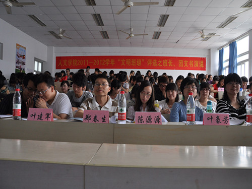 5月23日下午2点,bat365在线中国官网登录入口2011-2012学年第二学期"文明班级"评比之班长、团支书演说活动在bat365在线中国官网登录入口302教室顺利举行。学院辅导员麻法全老师、叶豪芳老师和参赛班级的班主任作为嘉宾评委出席了本次活动,院学生会各部长也作为评委出席。本次活动由学生会组织部部长林武主持,参加现场演说比赛的班级分别有10中本一班、10历本班、11中本一班、11中本二班和11中本三班。
