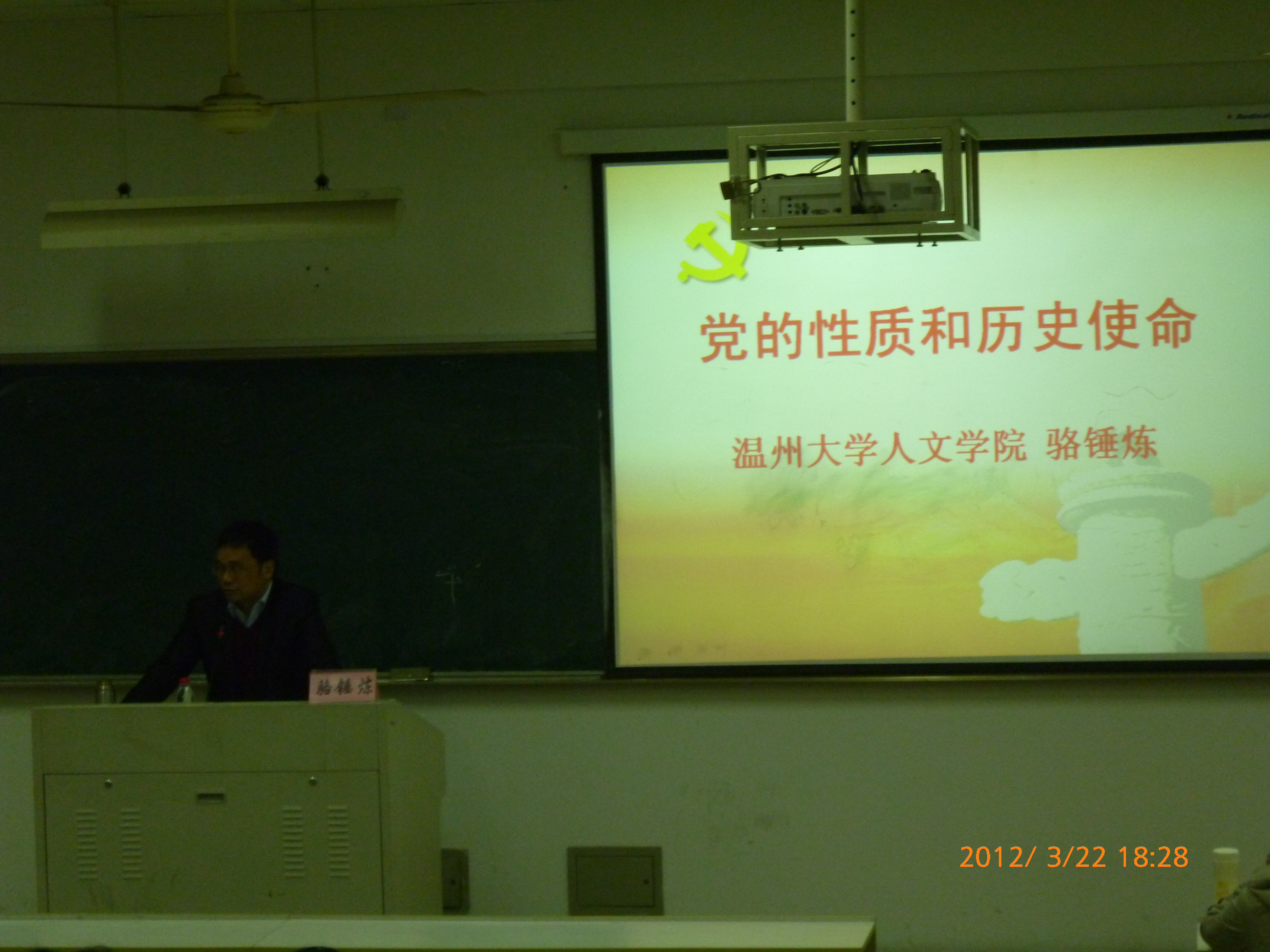 2012年3月22日晚18时30分,bat365在线中国官网登录入口第十五期党校培训第二课在1-301开课。bat365在线中国官网登录入口党总支副书记骆锤炼老师作为主讲人出席了本次党课。77名党校的学员和党员之家工作人员积极主动地前来聆听讲座。