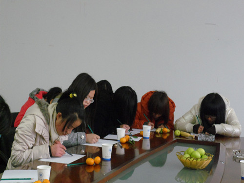王校长的讲话赢得了学子们的支持和掌声。在掌声中,又进入了一个新游戏环节"画画我心中的王校长"。在短短的时间内,同学们都发挥自己的想象,描绘了一个个充满着爱和阳光的画面。有人把王校长画成了圣诞老人,有人则画了太阳、园丁。。。。。。王校长的精神指引和生活关怀,使同学们都深深的感激并铭记着。整个交流会也因同学们的奇思妙想而欢声笑语一片。