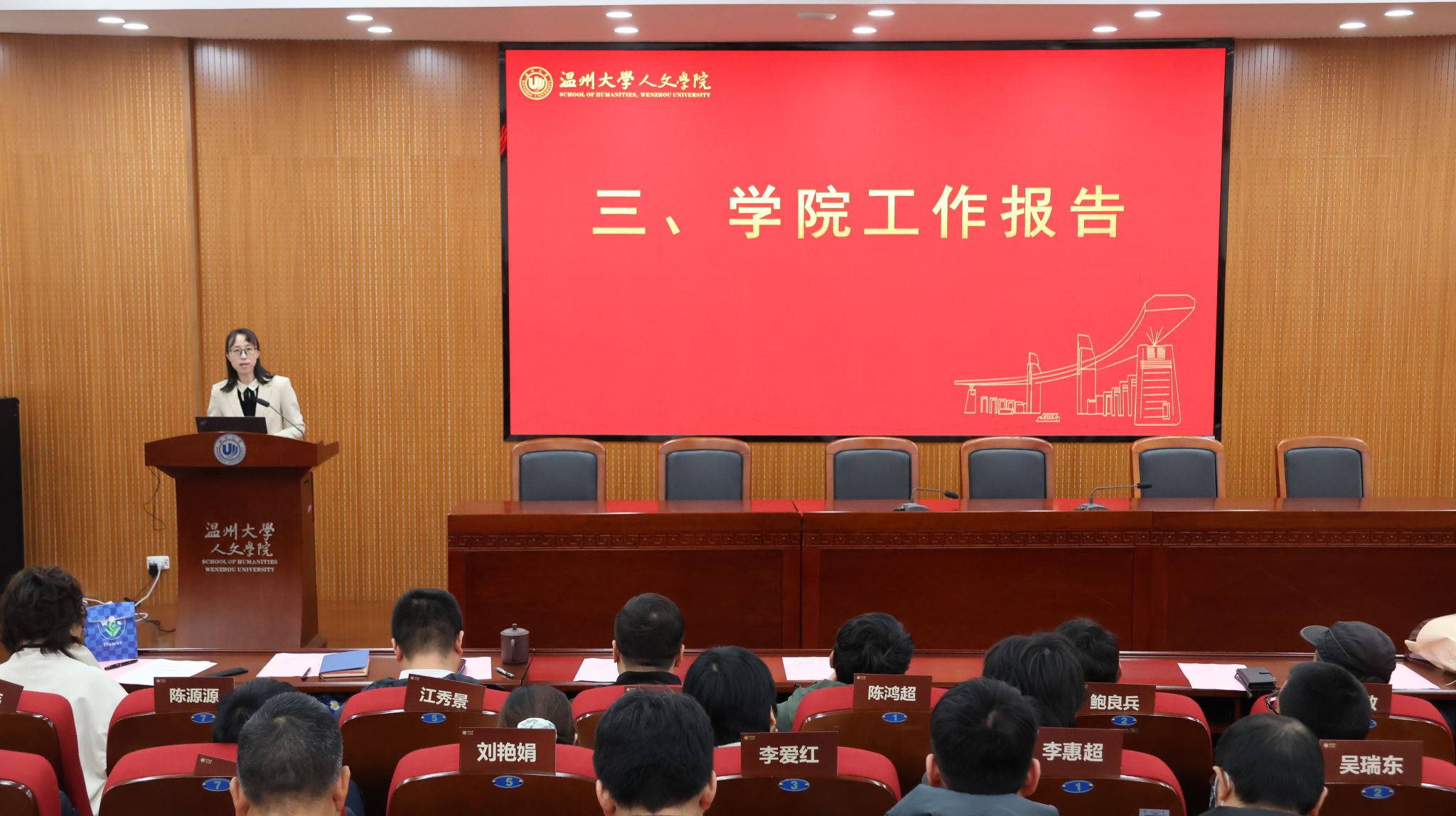 陈源源副院长作学院工作报告,从“文以立心、文以载道、文以兴业、文以化人”四个维度系统回顾2025年主要工作成绩,并提出2026年要紧扣“改革、提质、铸魂”三大核心,聚焦“三一二”厚基固本 “十五五”谋篇启新,具体开展12项重点工作,号召全院教师凝心聚力,推动学院事业再上新台阶。