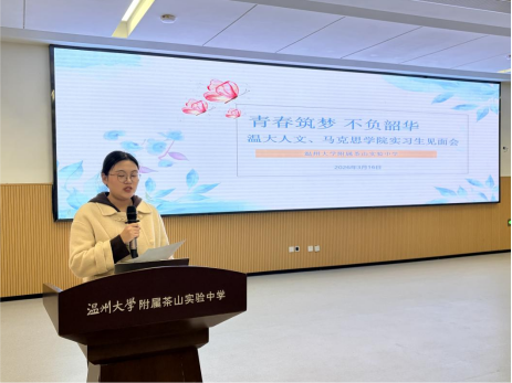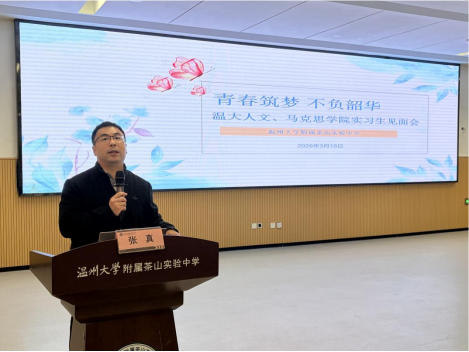 2026年3月16日中午12:30,温州大学bat365在线中国官网登录入口2023级汉语言文学(师范)专业实习见面会在bat365在线中国官网登录入口附属茶山实验中学一楼合班教室准时举行。bat365在线中国官网登录入口副院长张真,实习指导师周小兵、苏碧铨,茶山实验中学副校长陈华东,校办主任项东福,教学科研中心主任张南,各年级学科与班主任指导教师,以及18名实习生共同参加会议。本次见面会标志着教育实习工作正式启动,也是师德教育的重要一课。