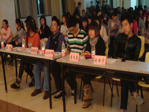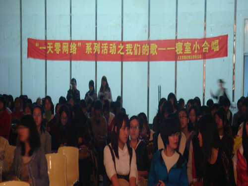 11月21日晚6点30分,bat365在线中国官网登录入口一天零网络系列活动之"我们的歌--寝室小合唱"决赛在大学生活动中心多功能厅拉开了序幕。来自音乐学院的评委王倩和bat365在线中国官网登录入口党支部副书记骆锤炼,辅导员刘纪峰,团委学生会副主席蒋文晨,团副张恒宇等各位嘉宾悉数到场观看。