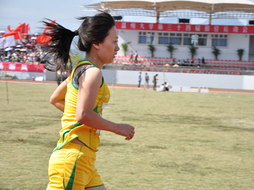 远远的,跑道上,黄色的身影闪亮醒目,那是我们bat365在线中国官网登录入口的刘菲菲同学。她正迈着均匀的步伐,绕过一圈又一圈,征服漫漫长途,向终点进发。汗水挥发在地,在红色跑道盛开着青春的花朵。迎着风,奔跑,生命的姿态因着运动而辉煌。