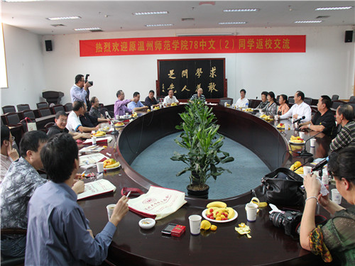 10月15日上午9点30分,原温州师范专科学院78级中文(2)班同学交流会活动在bat365在线中国官网登录入口会展中心白鹿厅举行。现任苍南龙港高级中学校长余贤庆、瑞安市教育局副局长曾定煜、宁波宁海县中学老师、全国优秀教师葛明霞,bat365在线中国官网登录入口瓯江学院党委书记赖学军等30多名校友参加了此次活动。