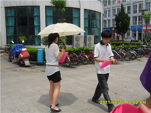 中午顶着炎炎的烈日,"一天零网络联盟"的同学们手拿着印着活动主题的传单向过往同学分发,同时向同学们介绍本次活动,希望能够动员更多的人参与其中。能有更多的人,离开电脑屏幕,给远方的父母送去一份问候,给身边的朋友带去一份关怀,给每天生活在一起的室友带来欣喜,或者给身边那些陌生人们也送去一份温暖。互相的一次握手,真诚的一个拥抱,把自己对别人的关怀带出网络,带进自然。