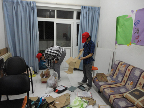 该日晚八点半,活动正式开始。首先,负责人将分工表分发给各个志愿者,各位志愿者分别根据自己所拿到的任务,进行分组,然后到自己负责的寝室楼开始回收旧物。本次活动与之前相比,有所不同。之前,志愿者都亲自将旧物从寝室里搬至指定地点。这次,志愿者人数减少,各志愿者工作任务不同,个别志愿者去寝室楼里,通知各位学生,请他们自己将旧物搬到楼下;而某些志愿者则在寝室楼下等待同学们的旧物,然后再将它们搬到指定地点。在志愿者们与同学们交流的过程中,志愿者们能礼貌地对待每一位同学,并帮助有特殊情况的寝室将旧物搬到楼下,大家都合作得很和谐。三十分钟左右,旧物回收结束,各位志愿者们又在C8-120对旧物进行了整理,以便于存放。在整理的过程中,各位志愿者积极性都很高,1个小时左右,就将本次大量旧物整理完成。