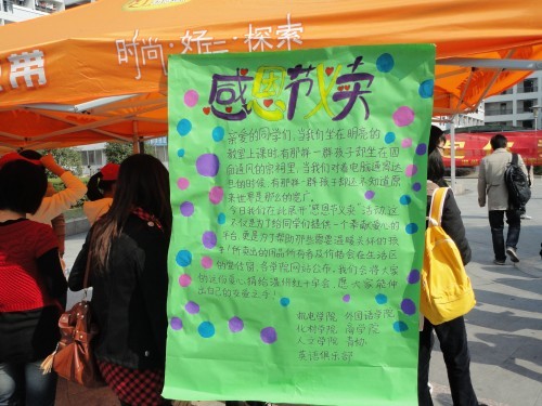2010年11月25日12点至16点30分,bat365在线中国官网登录入口、商学院、机电工程学院、化材学院四个学院的青年志愿者协会以及英语俱乐部在温大C区凉亭共同合作开展“感恩节义卖”活动。