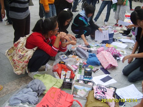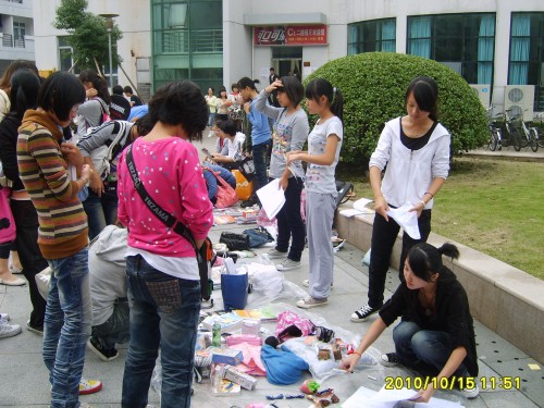 在活动开始的前一天,协会的会员就已经做好了充分的准备,他们两三人一组,进入各个寝室进行宣传造势并收集学生们要出售的二手物品,并在C区宣传栏张贴海报。10:40,协会的理事、干事就已就位,会长开始分派任务。然后活动就正式开始。陆续有同学参与进来。他们凉亭附近的地上摆开了"地摊",试着招揽生意。由于前天的有效宣传,交易的物品颇丰,有各种衣服、裤子、书本、学习用品等。会员们扮演了一回摊主的角色。像模像样地与买主讨价还价。有的会员负责收钱、签收交易协议、盖章。慢慢地,越来越多的人开始注意到我们的活动,饶有兴趣的搜寻自己感兴趣的物品,更有学生客串卖家,活动达到高潮。14:00,活动结束,围观的人群才渐渐散去。