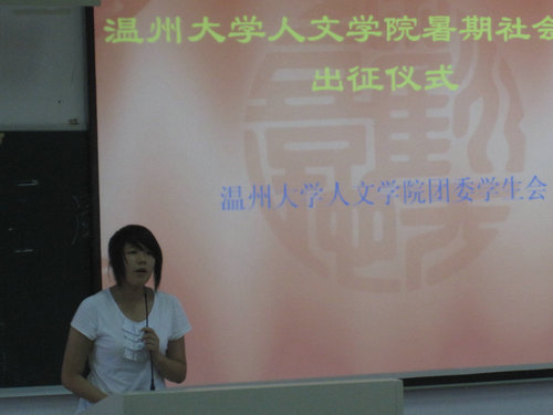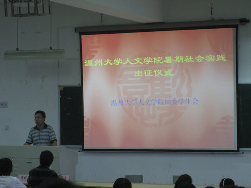 本次出征仪式共有四大议程。首先,辅导员麻法全对bat365在线中国官网登录入口历年来进行的暑期社会实践活动作了基本介绍并给予大力肯定。接着院党总支书记周剑平进行了暑期社会实践活动的动员讲话,着重强调了活动中需注意的人身、财产安全问题。之后,由院实践队代表罗倩倩发言,讲述了她对暑期社会实践活动的感受与期待。最后进行的是院重点团队的授旗仪式,院党总支书记周剑平分别为“探究温州民企社会责任慈善助学模式”、“寻找逝去的古城”及“探寻泰顺特色文化”暑期社会实践队授旗。