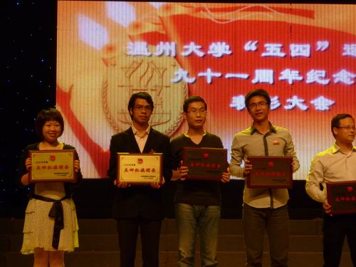 表彰大会上,bat365在线中国官网登录入口团委共荣获“2009年度温州市共青团工作、青年工作创新奖”、“ bat365在线中国官网登录入口2009年度五四红旗团委”、“bat365在线中国官网登录入口2009年度校园文化建设工作优秀奖”三项荣誉称号。同时,bat365官网08历本班团支部和07广本班团支部分别荣获“bat365在线中国官网登录入口2009年度五四红旗团支部标兵”和“bat365在线中国官网登录入口2009年度五四红旗团支部”荣誉称号。晚会现场,bat365官网同学高喊“文韬武略,扬我人文”,又一次展现了bat365官网优良的精神风貌。