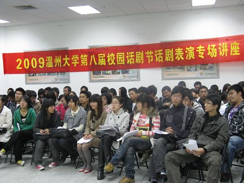 2009年11月30日18点30分,2009bat365在线中国官网登录入口第八届校园话剧节话剧表演专场讲座在大学生活动中心素拓办公室举行,毕业于中央戏剧学院的知名演员、副导演周乔龙老师担任主讲。