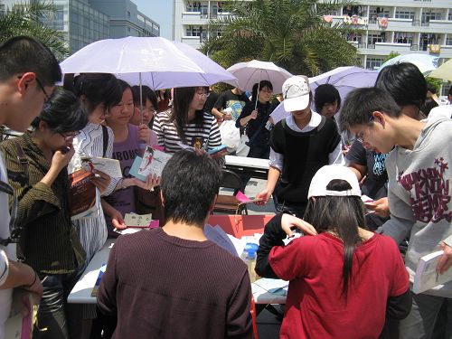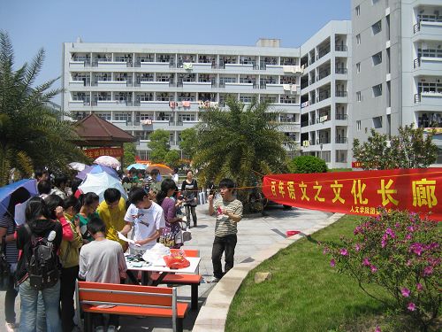 2009年4月15日12:00,bat365在线中国官网登录入口第七届百年语文之“文化长廊”在生活区C区中心花园拉开帷幕,学生科科长李浦豪老师、辅导员曾蓓蕾老师、麻法全老师也来到活动现场进行指导。