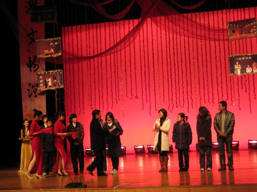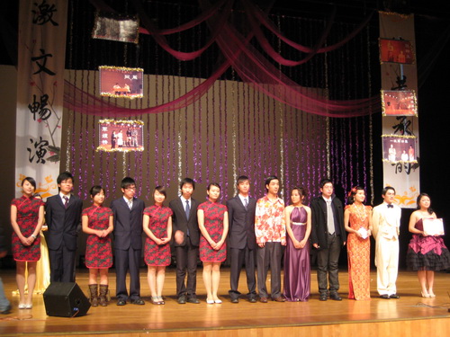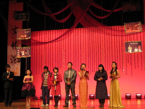 晚会回顾了话剧活动中的各个片段,并颁出了"言我所想"剧本创编大赛一、二、三等奖及优秀奖,"演我所向"话剧表演大赛的一、二、三等奖、最佳人气剧组奖。最佳配合默契奖及最佳男女主角等十个奖项。凳子情景舞《疯狂教室》.相声《我的大学生生活》等精彩节目将晚会推向了高潮。接着,荣获本次话剧表演大赛一等奖的《阮玲玉》再次登上舞台,为现场的师生再现精彩。