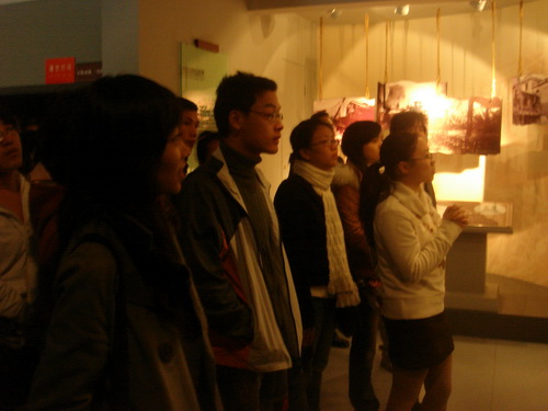 在讲解员的介绍下,我们了解到温州地方党组织的创建与大革命时期、土地革命战争时期、抗日战争时期和解放战争时期的革命情况。纪念馆中的场景复原使我们更形象的了解当时的革命斗争场面,而通过幻影成像而成的关于红十三军 刘英被捕杀害的过程,更是让全班同学在惊诧高超的现代科技的同时,感受到刘英的那种宁死不屈的革命精神。在解放战争时期的展厅中,那面特质的立体国旗给同学们留下深刻的印象,站在左前方看到的是一面五星红旗,而站在右前方却是许许多多烈士的照片,其寓意是"五星红旗是由无数名烈士的鲜血染成的"。