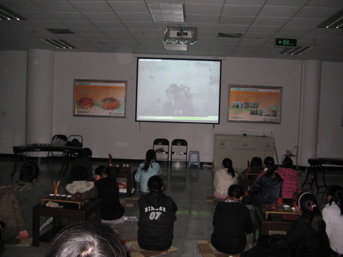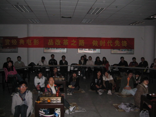 现场以一个客栈的形式布置,与精巧古典的古筝相伴,大家围坐在一起品茶、欣赏经典影片。笔力道尽的"酒"字招牌悬挂在四周,荧幕上的经典黑白电影《小城之春》正悠然上映,舒缓的音乐散开,复古的意境荡漾开来。同学们饶有兴致地欣赏着这部经典老片,剧中的一些情景不时引起现场阵阵笑声,大家都陶醉其中。
