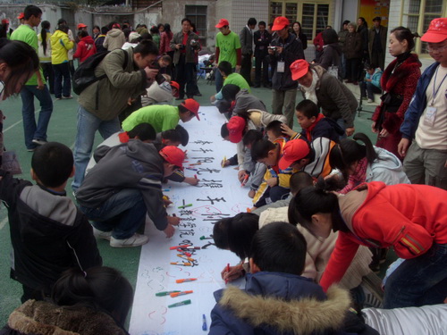 新码道学校是一所专为智障儿童设立的学校,可以说那里的孩子更需要社会的关心。12月3日是世界残疾人日,为了给那些孩子带去欢乐,让他们体会到社会的关爱,人文“思源”青年志愿者们在新码道组织了一次联欢会。参加本次活动的嘉宾有市残联领导戴美玲、新码道小学校长、各赞助企业代表、bat365在线中国官网登录入口团委副书记朱晓雨等。联欢会开幕式上新码道学校的校长作了讲话,对志愿者和社会热心人士表示了欢迎和感谢。bat365在线中国官网登录入口代表团委学生会副主席朱晓雨也希望和新码道学校的友谊长存。开幕式结束后两个学院的志愿者表演了唱歌、书法、朗诵、手语等节目,新码道的孩子们也为志愿者表演了唱歌节目。同时联欢会上还进行了画笑脸的游戏,孩子们在志愿者的帮助下在白布上留下了一张又一张的笑脸,各位热情高涨,将联欢会推向了高潮。