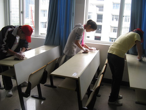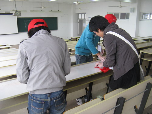 本次活动得到了院领导的大力支持和广大志愿者的积极参与。上午8:30参加本次活动的志愿者在bat365在线中国官网登录入口集合,分配任务后,各志愿者带上手套,拿着清洗剂到所分配到的教室认真地清洗课桌上的各种涂画痕迹。活动中,同学们发扬吃苦耐劳的精神,对bat365在线中国官网登录入口教学楼所有课桌上的污垢进行了全面的清洗。全体参加人员始终以"还课桌一张美丽的面容,还教室一份温馨的宁静"为目标,辛勤劳作,刺鼻的清洁剂、顽固的污渍丝毫没有影响同学们工作的积极性。虽然有的痕迹一时难以清除,但大家都耐心地擦拭着,生怕漏掉了一个小斑点。