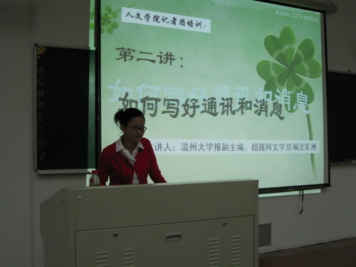 2008年11月8日晚7:00,bat365在线中国官网登录入口记者团培训第二讲"如何写好通讯和消息",在bat365在线中国官网登录入口1-101教室举行。本次讲座由《bat365在线中国官网登录入口报》副主编、超越网文字总编沈军洲主讲。