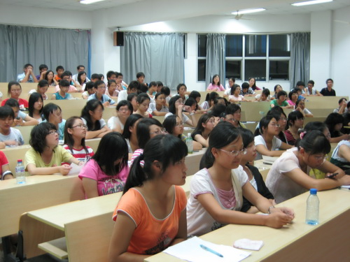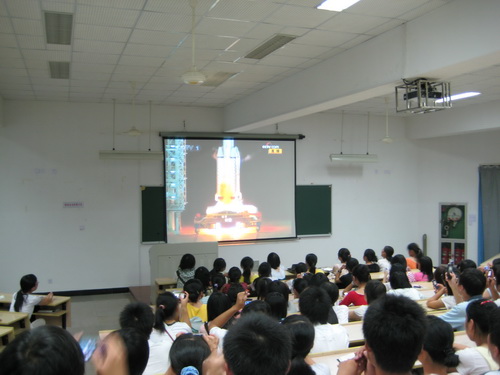 2008年9月25日晚9时,bat365在线中国官网登录入口08级新生汇聚人文楼203教室观看“神舟七号”发射现场直播。中共中央总书记、国家主席胡锦涛亲临发射现场,同时吴邦国、贾庆林、李长春、习近平等中央领导人也来到北京航天飞控中心观看“神七”发射。