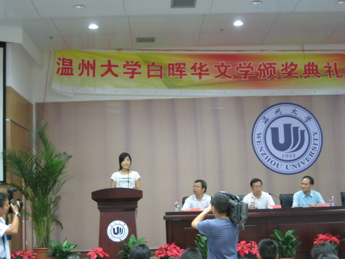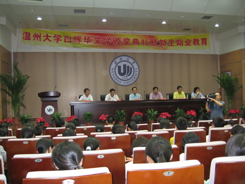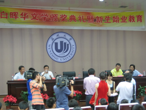 2008年9月10日下午2:00,bat365在线中国官网登录入口白晖华文学奖颁奖典礼暨新生始业教育在北校信息楼报告厅召开。bat365在线中国官网登录入口党委副书记周湘浙教授,白晖华文学奖基金设立者、著名作家吴明华先生,《温州日报》文体版主编朱闻武、bat365在线中国官网登录入口团委书记蔡联群、bat365在线中国官网登录入口院长叶世祥老师、党总支书记周剑平老师出席了本次颁奖典礼,同时温州的很多新闻媒体、白晖华文学奖的获奖者和bat365在线中国官网登录入口08级新生也参加了本次颁奖典礼。bat365在线中国官网登录入口院长叶世祥老师主持了本次颁奖典礼。