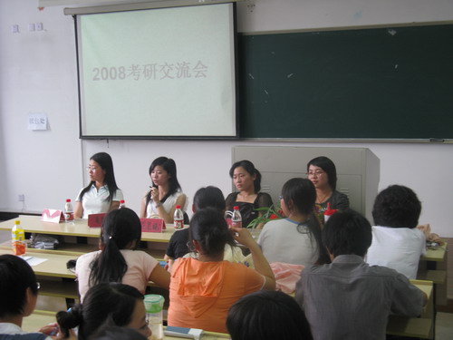 会上,她们讲述了考研的具体过程及考研各阶段的复习重点,着重强调了一些注意事项,告诫同学们报考志愿时要充分考虑专业的选择、报考学校这两个因素,将两者结合,综合决策。定好目标学校和专业后,通过各种渠道搜集考研资料,适当参加考研补习班。另外,根据自身经验给同学们推荐了一些有益的辅导书,讲解了专业课、基础课的复习技巧。最后,讲述了面试过程中出现的问题及解决方法等。在自由交流阶段,学弟学妹们不断发问,四位考研成功者予以认真解答。交流会在热烈的气氛中结束。