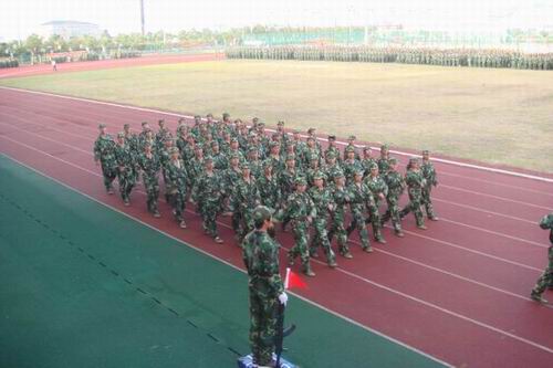 未进操场,响彻云霄的口号声就灌入了耳朵,坚定、有力。马上让人感受到了军营里特有的那种品质和氛围。进入操场,排演正在进行。前台指挥若定,广播里介绍着迎面走来的方阵的情况,还未进场的方阵焦急紧张而又期待地等待。整齐的步伐、一致的口号。一排排的方阵从司令台前面走过。指挥员也“毫不留情”地指出各自的不足之处,并作了简要点评。人文学子在军训演习前仍坚持着作为一个“军人”的骄傲,在烈日中低档骄阳,在困苦中坚持胜利,时刻准备着。