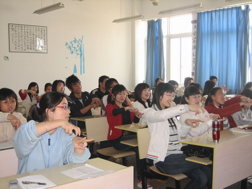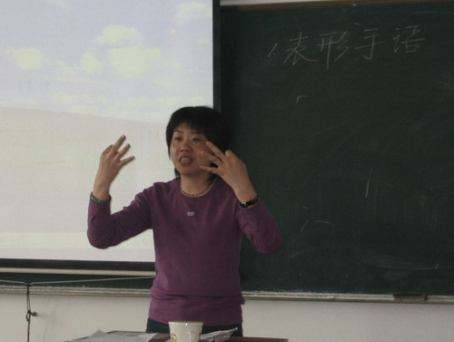 一开始,戴老师向大家介绍了组成手语的几种方式,如表形的、表象的、表意的等等,并且一一举例,象“房”就是用两手的手指顶住做成一个像房子的形状来表示。学员们带着种种好奇心跟着老师做着手势,全场学习气氛浓厚。接着学员与老师进行了一问一答的互动,教室里传出一片片笑语。最后伴随着《感恩的心》这首歌的响起,学员们跟着老师做着一个个优美的手势,这次培训也就在这首大家耳熟能详的歌中结束了。