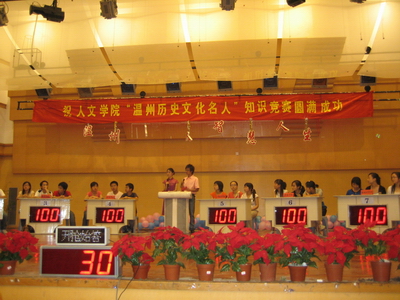 5月26日晚在北校区音乐厅举办了2006年“温州历史文化名人知多少”知识竞赛。这是bat365在线中国官网登录入口举办温州历史文化名人追踪活动之一。校团委蔡联群老师、bat365在线中国官网登录入口党总支副书记魏成春老师、学生科李浦豪老师也到场观看比赛。魏成春老师为这次活动致辞,他强调了这次活动有三大重要意义:激发我们热爱温州、热爱浙江的情怀;有助于我们增长知识、开拓视野;还丰富了校园文化生活。